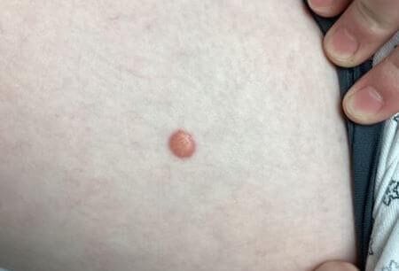 A 12-year-old boy is referred for evaluation of a skin lesion located on his right inner thigh. Can you make the correct diagnosis?